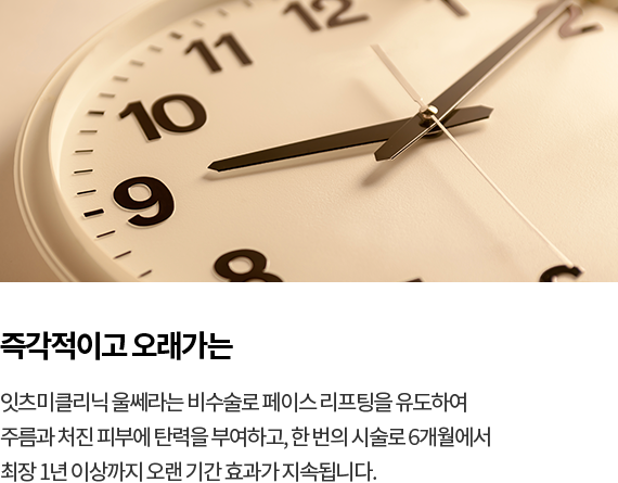 잇츠미의원 울쎄라 리프팅은 시술 후 1-3개월간 개선효과가 서서히 나타나고, 개인따라 차이가 있지만 최대 1년정도 유지됩니다.